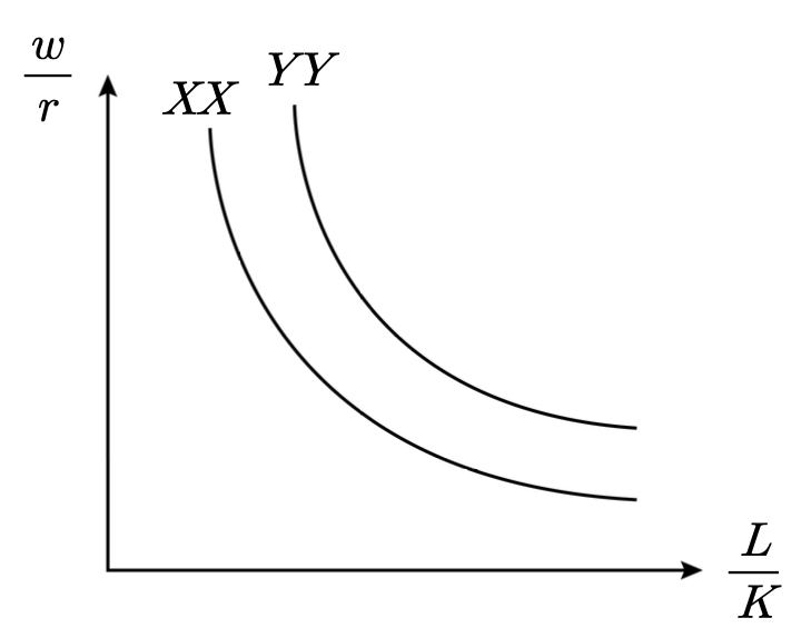 A국과 B국은 자본과 노동의 두 가지 생산요소를 이용하여 X재와 Y재 두 재화를 생산하고 있다. 생산요소는 한 국가 내에서 산업 간 이동은 자유롭지만, 국가 간 이동은 불가능하다. 생산된 두 재화는 아무런 제약 없이 국가 간에 거래된다. 양국의 두 재화를 생산하는 기술은 동일하며, 소비자의 기호도 동일하다. X재와 Y재 생산에 있어서 임금–임대료 비율 ($\frac{w}{r}$)과 노동–자본 비율 ($\frac{L}{K}$)은 다음 그림과 같다.